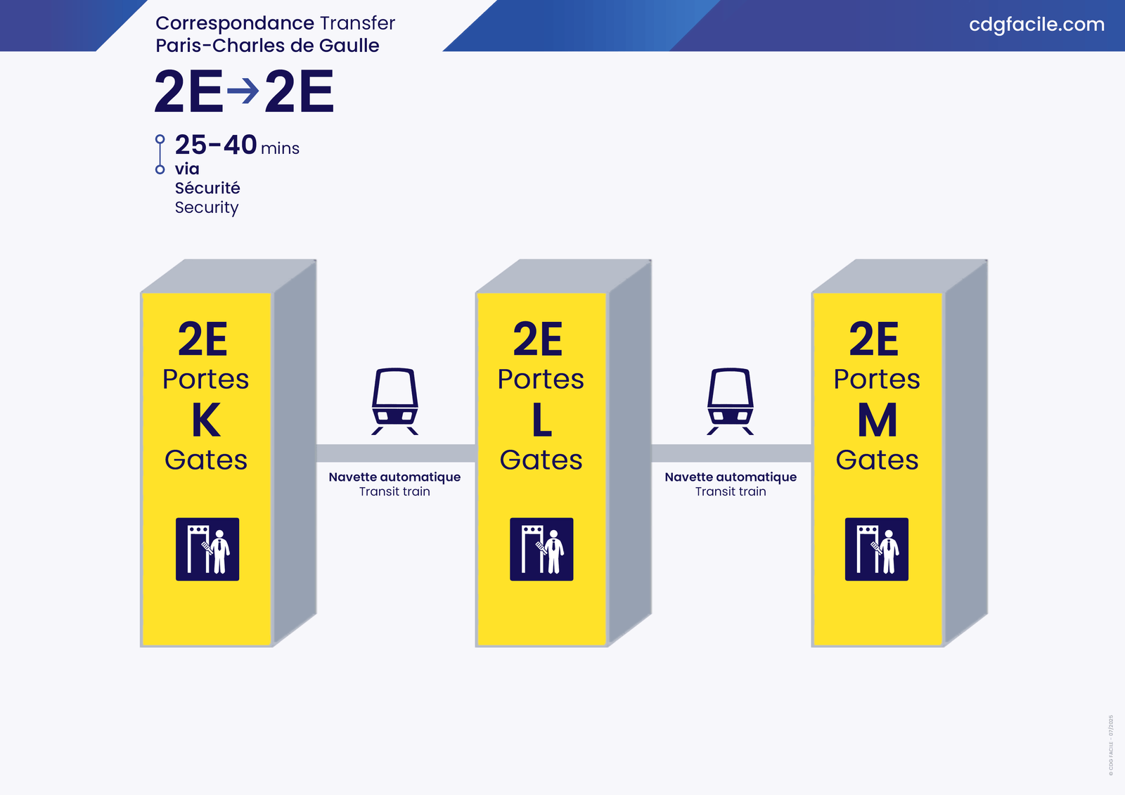 Terminal 2E has three areas for arrivals and departures -Gates K, L, and M- all connected by an automated transit train. Make sure you know exactly which gate your flight will depart from to avoid confusion.
