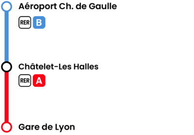 To travel between Paris-Gare de Lyon train station and Charles de Gaulle Airport by public transport, take RER Line B combined with RER Line A.