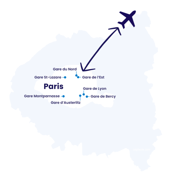 Gare d’Austerlitz • Gare de Bercy • Gare de l’Est • Gare de Lyon • Gare Montparnasse • Gare du Nord • Gare Saint Lazare