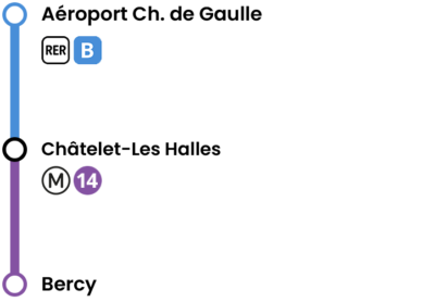 Take RER Line B to Châtelet-Les Halles (all trains stop there), then transfer to Metro Line 14 (in the direction of Aéroport d’Orly) towards Bercy, then walk approximately 350 meters to Gare de Bercy.